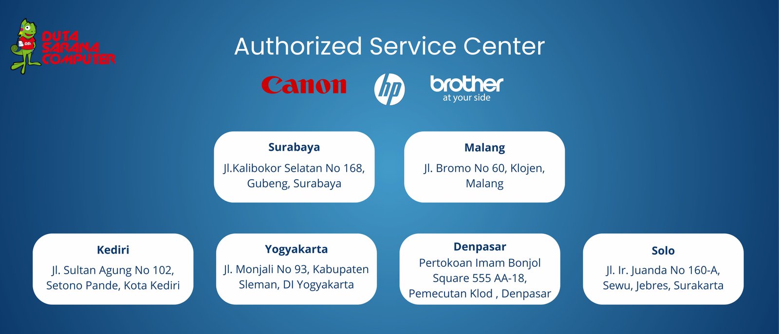 Kami juga sekaligus sebagai Authorized Service Center dari Canon, HP dan Brother.