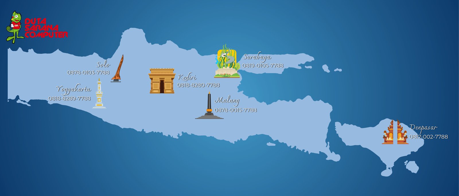 Kami memiliki total 6 cabang di Jawa dan Bali (Surabaya, Malang, Kediri, Jogja (Yogyakarta)