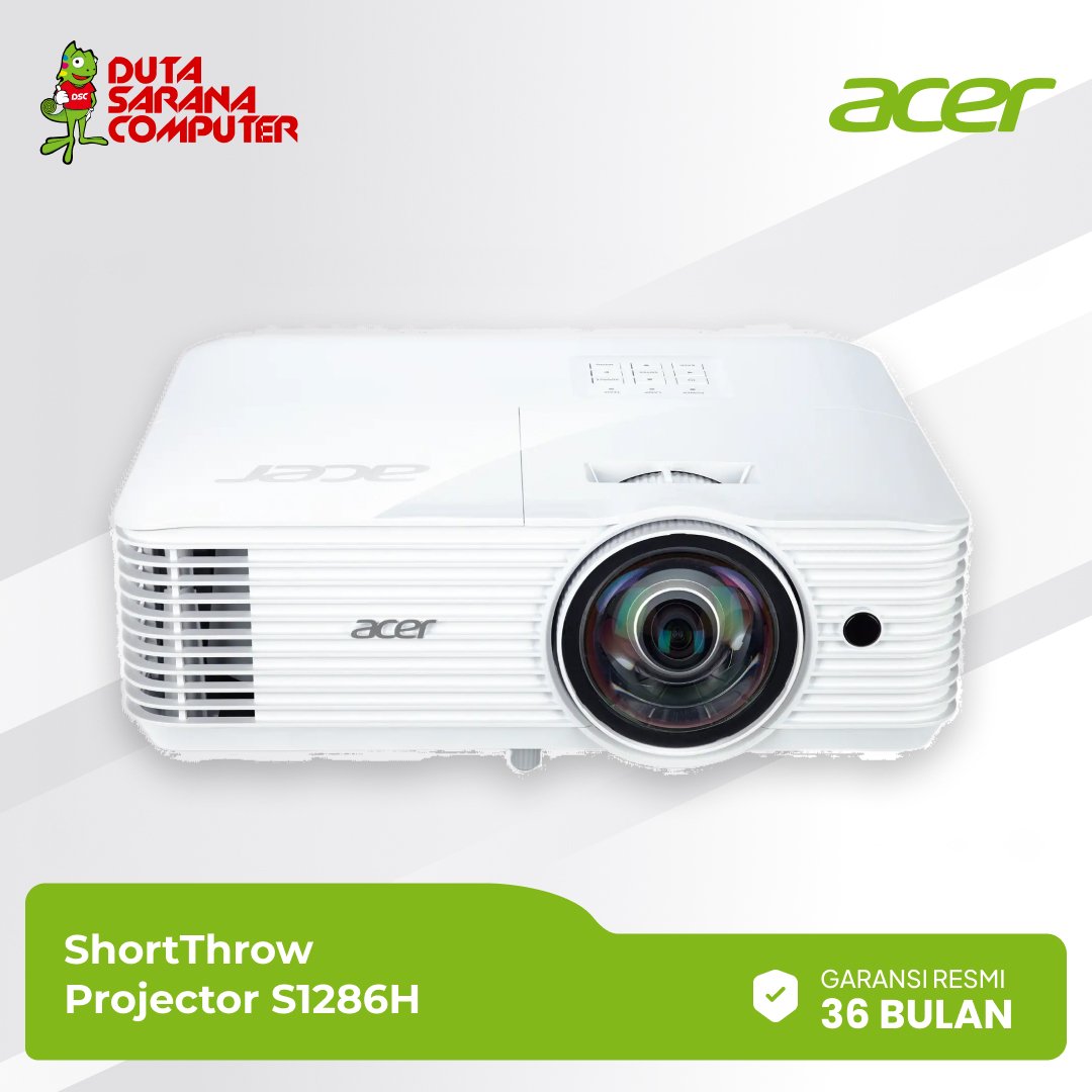 Spesifikasi proyektor Acer S1286H Projection system 0,55” DarkChipTM 3 DMD Resolution XGA (1.024 x 768) Maximum: WUXGA (1.920 x 1.200) Brightness 3.500 ANSI Lumens (Standard) 2.800 ANSI Lumens (ECO) (Compliant with ISO 21118 standard) Aspect ratio 4:3 (Native), 16:9 (Supported) Contrast ratio Dynamic Black 20.000:1 Throw ratio (0.617) 77”@97cm Projection lens F = 2.70, f = 7.15mm, Manual Focus Keystone correction +/-400 (Vertical, Manual) Lamp life 4.000 hours (Standard) 6.000 hours (ECO) 10.000 hours (ExtremeEco) Noise level 32 dBA (Standard), 24 dBA (ECO) Input interface 1 x Analog RBG/Component Video (D-sub) 1 x HDMI (Video, Audio, HDCP) 1 x PC Audio (Stereo mini jack) 1 x Composite Video (RCA) Output interface 1 x PC Audio (Stereo mini jack) 1 x DC Out (5V/1A, USB Type A) 1 x Analog RBG (D-sub) Control interface 1 x RS232 (D-sub) Dimensions 313 mm X 255,5 mm X 113,7 mm (w/feet) 12,3” X 10” X 4,5”