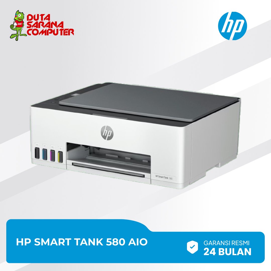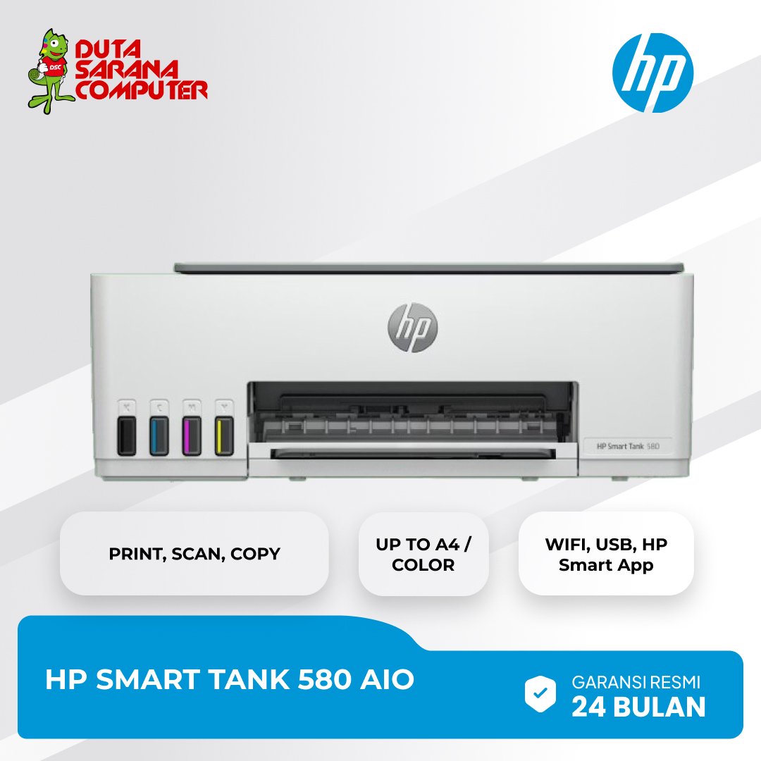 Printer HP Ink Tank 580 mendukung konektivitas nirkabel sehingga bisa mencetak dokumen dari smartphone dengan menggunakan Aplikasi HP Smart, mampu mencetak dalam jumlah besar dan harga yang terjangkau, Hasil Cetaknya pun lebih awet karena tidak mudah pudar dan tahan air. Kualitas Cetaknya luar biasa mampu mencetak teks lebih tajam dengan warna lebih cerah tanpa batas tepi. Apa saja yang di dapat : • Mesin / Printer Baru HP Ink Tank 580 (Inkjet Color) • Plus Tinta Premium XANTRI CMYK • New Box • Kabel Power & Kabel USB • CD Driver Suppot Tinta Tipe : • HP GT53 Black • HP GT52 Cyan • HP GT52 Magenta • HP GT52 Yellow Spesifikasi : Print, Scan, Copy & Wireless Print speed (ISO): Up to 12/5 ppm (Blk/Clr)4 1.2” icon display with guided backlit ID Copy Button Up to 12000 black or 6000 color pages1 Self-healing single-band Wi-Fi with BLE3 Made up of 45% recycled plastic5 Duty cycle: Up to 30000 pages Borderless printing Input capacity: 100-sheet Low on ink sensor6 Quick and easy self-guided mobile setup with the HP Smart App Garansi Resmi HP Indonesia 2 Tahun